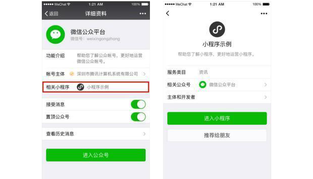 三、公眾號關聯(lián):同一主體的小程序和公眾號可以進行關聯(lián),并相互跳轉,該功能需要經開發(fā)者自主設置后使用。一個公眾號可以綁五個小程序,但一個小程序只能被一個公眾號綁定。你可以通過公眾號查看并進入所綁定的小程序,反之,也可以通過小程序查看并進入所關聯(lián)的公眾號。